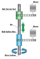 Once Ball Screw Nut directed to Motor turns, Ball Spline Nut will sustain not turning and Screw Shaft moves up and down.